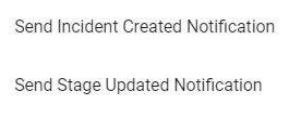 As stated in Creating An Incident, Administrators can also send notifications that an incident has been created and that an incident stage has been updated by clicking on the Notifications button on an incident and then clicking on the type of notification.