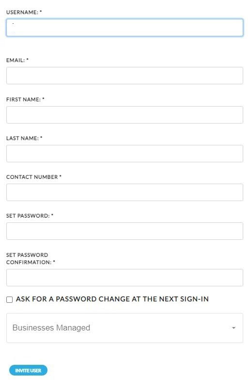 Enter the username, email, first and last name, phone number and password. After the password is entered, click on the Ask For A Password Change At The Next Sign-In box to enable the new manager to change the password. After the password change box is checked, click on Businesses Managed. A list of the businesses for the owner or representative will appear. Check the box next to each business that the business manager will oversee. After the businesses are checked, click Invite User.