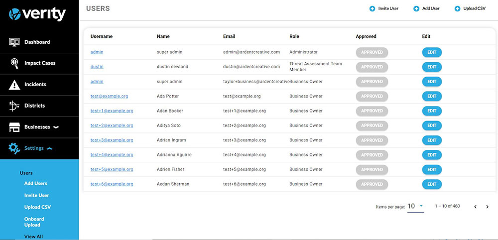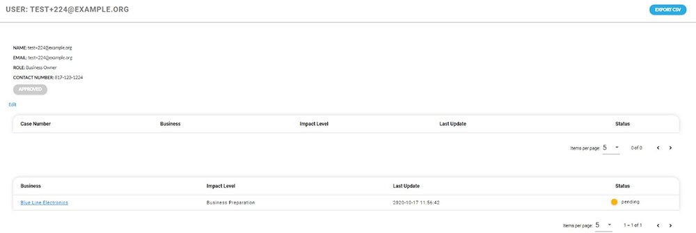 This page contains the user’s information, the cases the user has submitted, and the user’s business. The user’s information can be edited from this page by clicking the Edit button, below Approved.